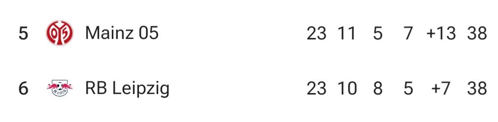 원정 팀 마인츠는 5등에 위치해 있으며, 승점은 같습니다.