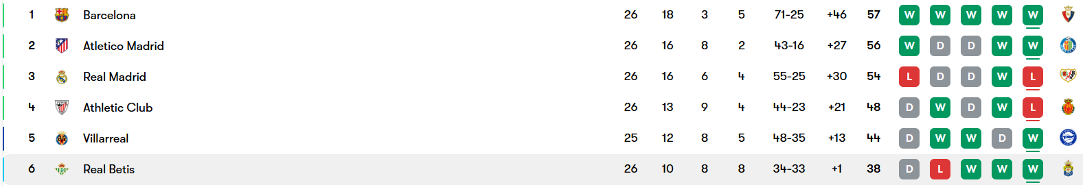 레알 베티스는 라리가에서 리그 6등을 기록중입니다.